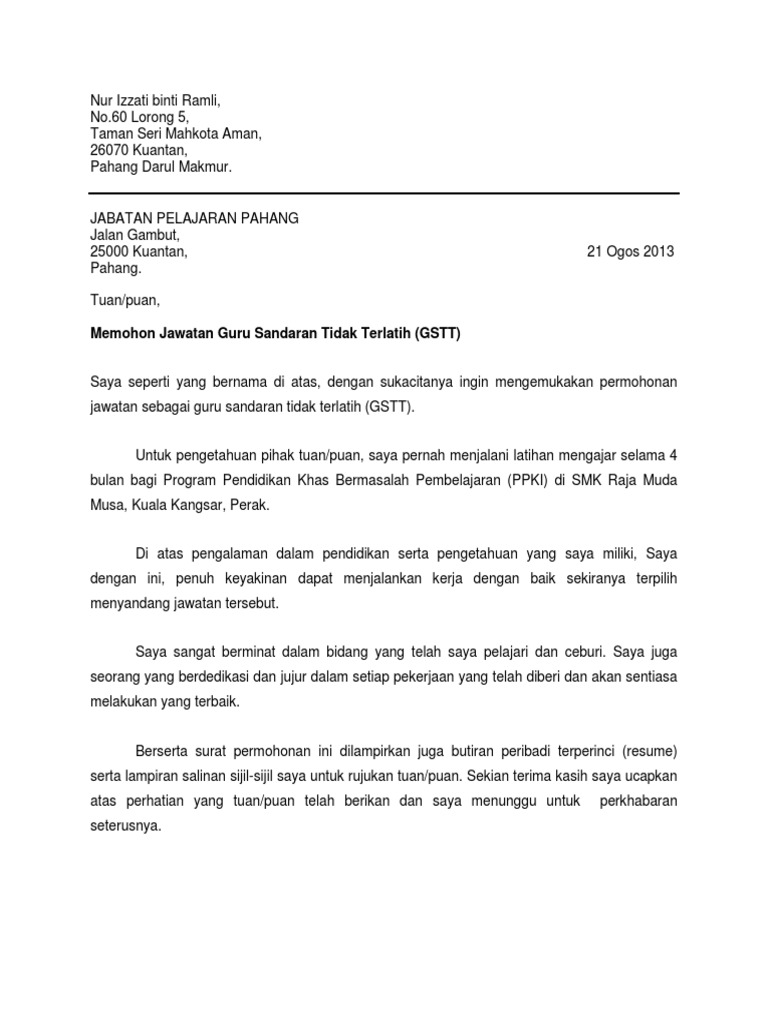 Merujuk kepada perkara di atas saya ____________________________________ ingin. Contoh surat rasmi permohonan jawatan guru kosong kerjo.